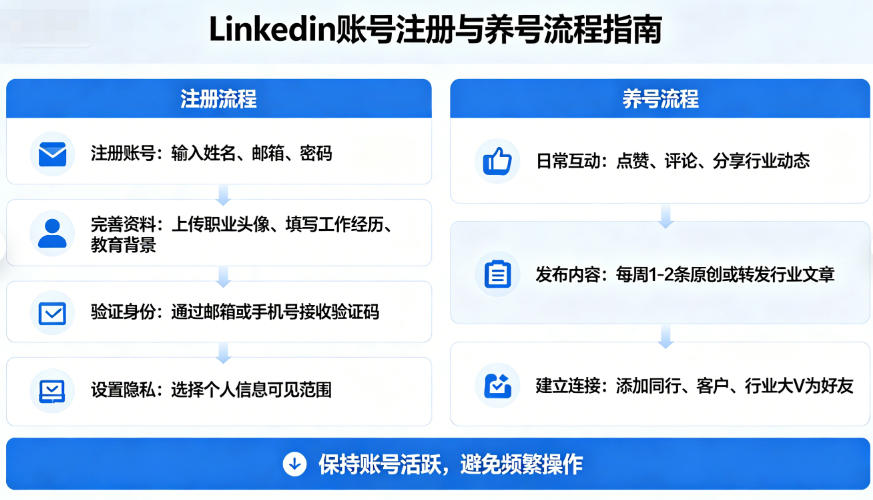 在全球化商业交流与职业社交不断深化的今天,LinkedIn 早已不再是简单的求职平台,而是连接全球商机、拓展行业人脉、树立个人专业形象的核心阵地。无论是外贸从业者、职场人士,还是企业品牌运营者,一个健康、活跃且权重稳定的 LinkedIn 账号,都能带来源源不断的合作机会与行业资源。但很多新手在注册后便陷入误区,要么账号长期沉寂毫无效果,要么因操作不当触发平台限制,最终难以实现稳定使用。本文将从注册搭建到精细化养号,完整梳理一套可落地的操作流程,帮助新手快速上手,逐步打造出高权重、高安全性的优质账号。